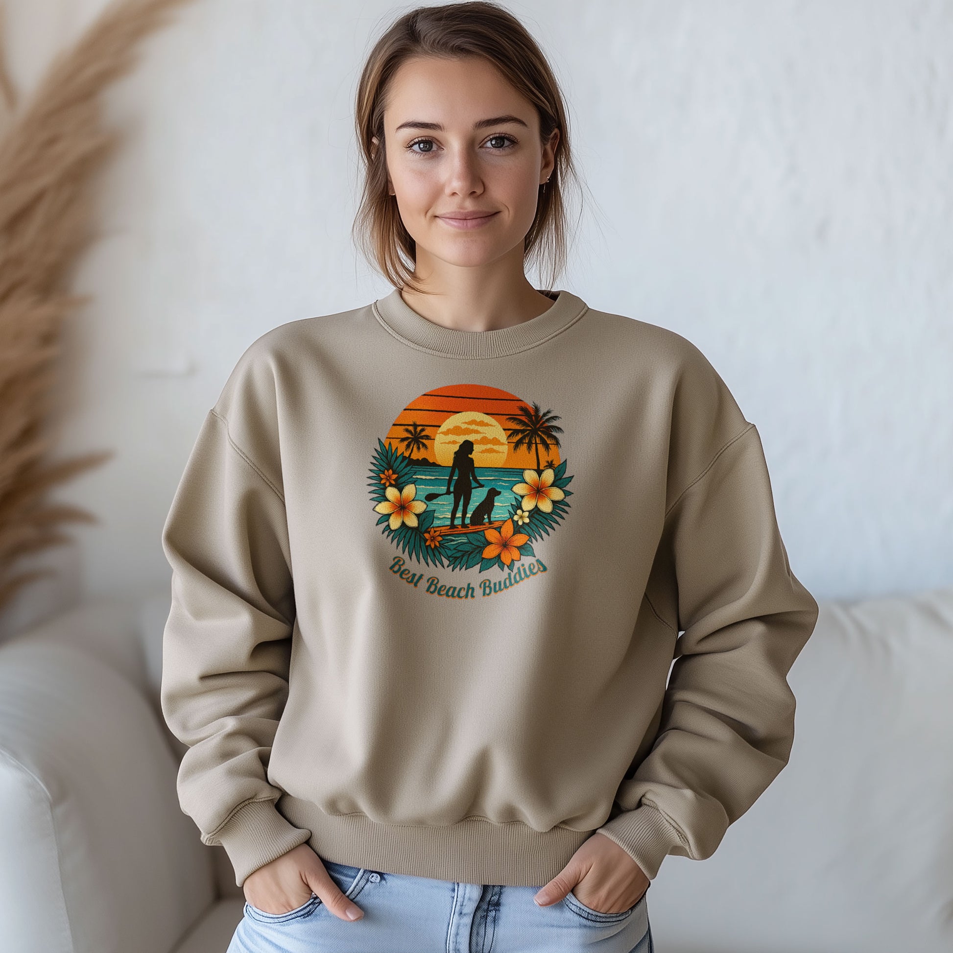 Für alle Hundeliebhaber, die ihre Verbundenheit gemütlich und stilvoll ausdrücken möchten! Unser hochwertiges Best Beach Buddies Sweatshirt vereint angenehme Wärme mit einem einzigartigen Design: Der retro-inspirierte Sunset-Print zeigt die Silhouetten einer Paddle-Boarderin und ihres vierbeinigen Begleiters – ein Statement für Freundschaft und gemeinsame Strandabenteuer.