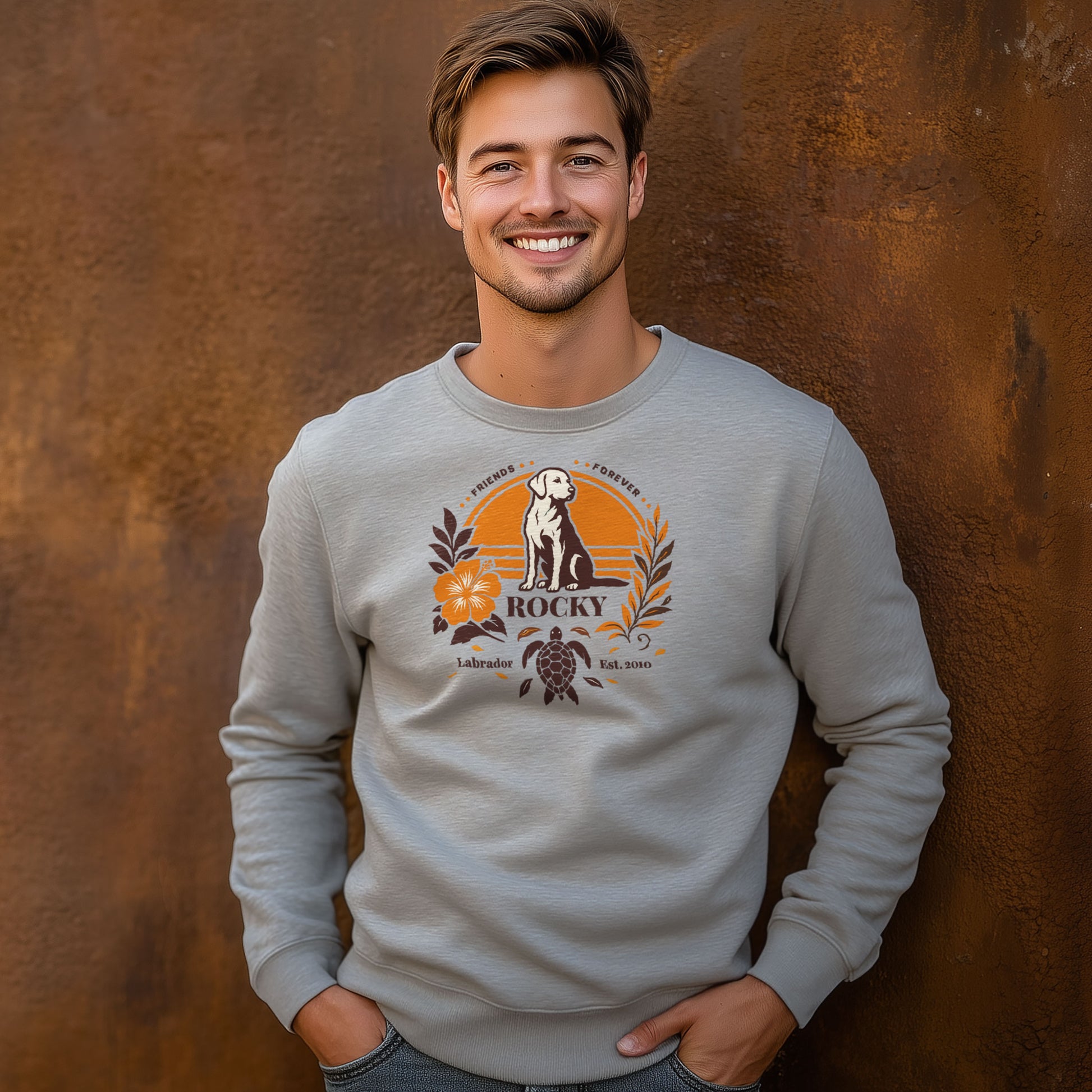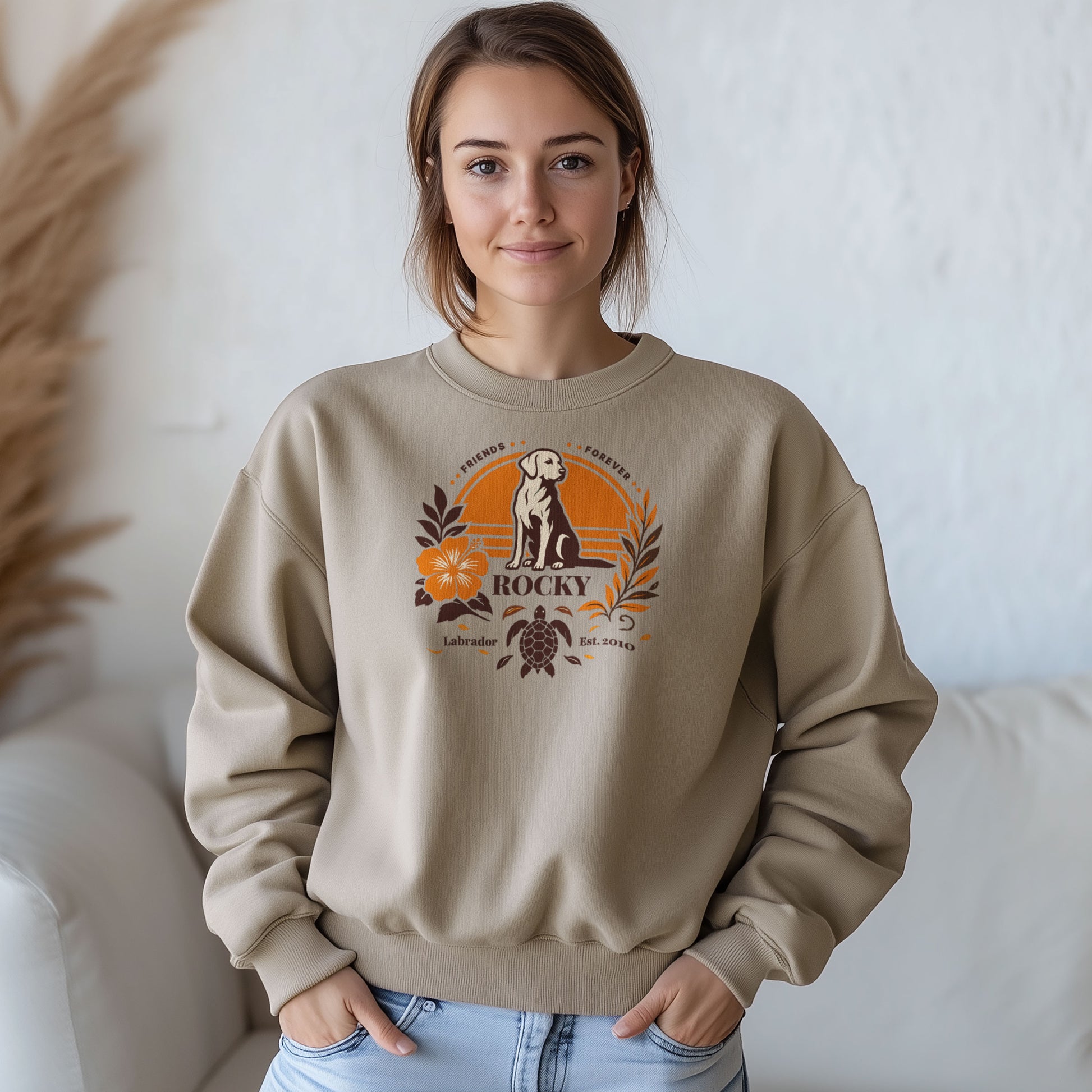 Unser Forever Friends Sweatshirt vereint lässigen Komfort mit einem coolen Hawaii‑Retro‑Design: Ein stilisierter Labrador vor einem warmen Sonnenuntergang, umrahmt von Hibiskus, Palmenblättern und einer kleinen Schildkröte.